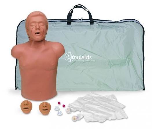 An economical price tag doesn't detract from the effectiveness of this incredible training aid. Constructed of soft, realistic vinyl plastic over polyurethane foam, the manikin's features include a long torso for realistic abdominal thrusts, realistic head tilt and chin lift for opening airway, and anatomical landmarks including sternum and ribcage plus substernal notch. His airway can be easily manipulated to simulate airway obstruction or choking situations. This manikin has Arabic features. Includes three disposable/lung airway systems and three channel design mouth/nosepieces. Nylon carry bag and kneeling pads included. Measures 28 x 18 x 10, weighs 15 lbs. Made in the USA by Simulaids.
