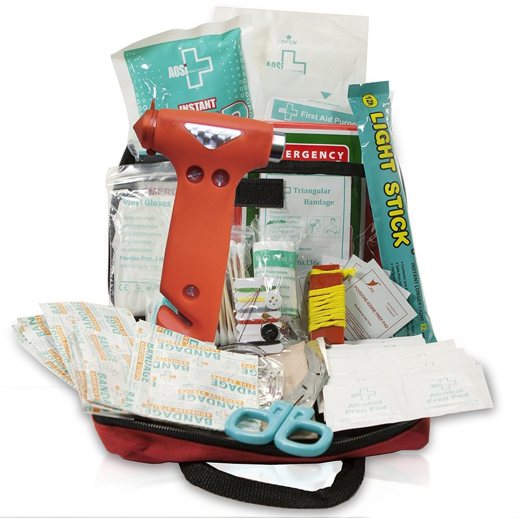 The kit contains 100 pieces of the basic gauze, pins, pain management pills and pads. The kit is nylon with a convenient handle for carrying. With the kit measuring 6 inches by 5 inches, it makes it easily stored in a car, RV, Van, and motorcycle and it has small storage compartments. The contents are easily used by the layperson as well as the healthcare provider.